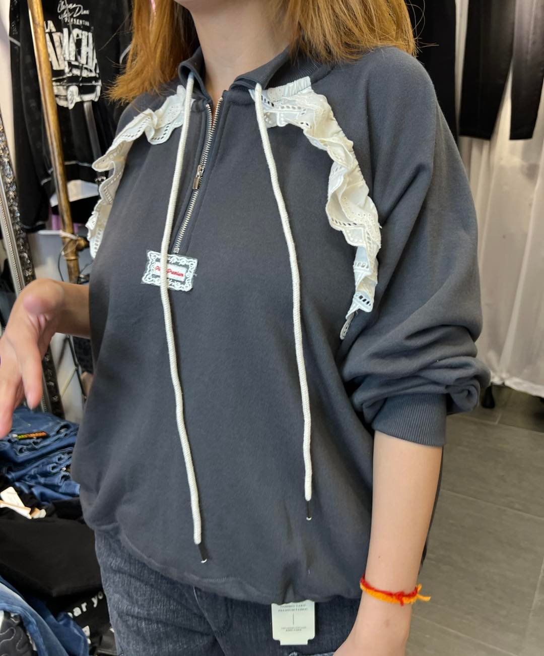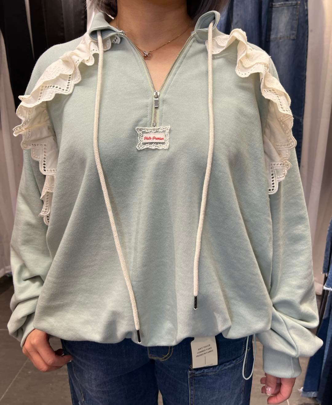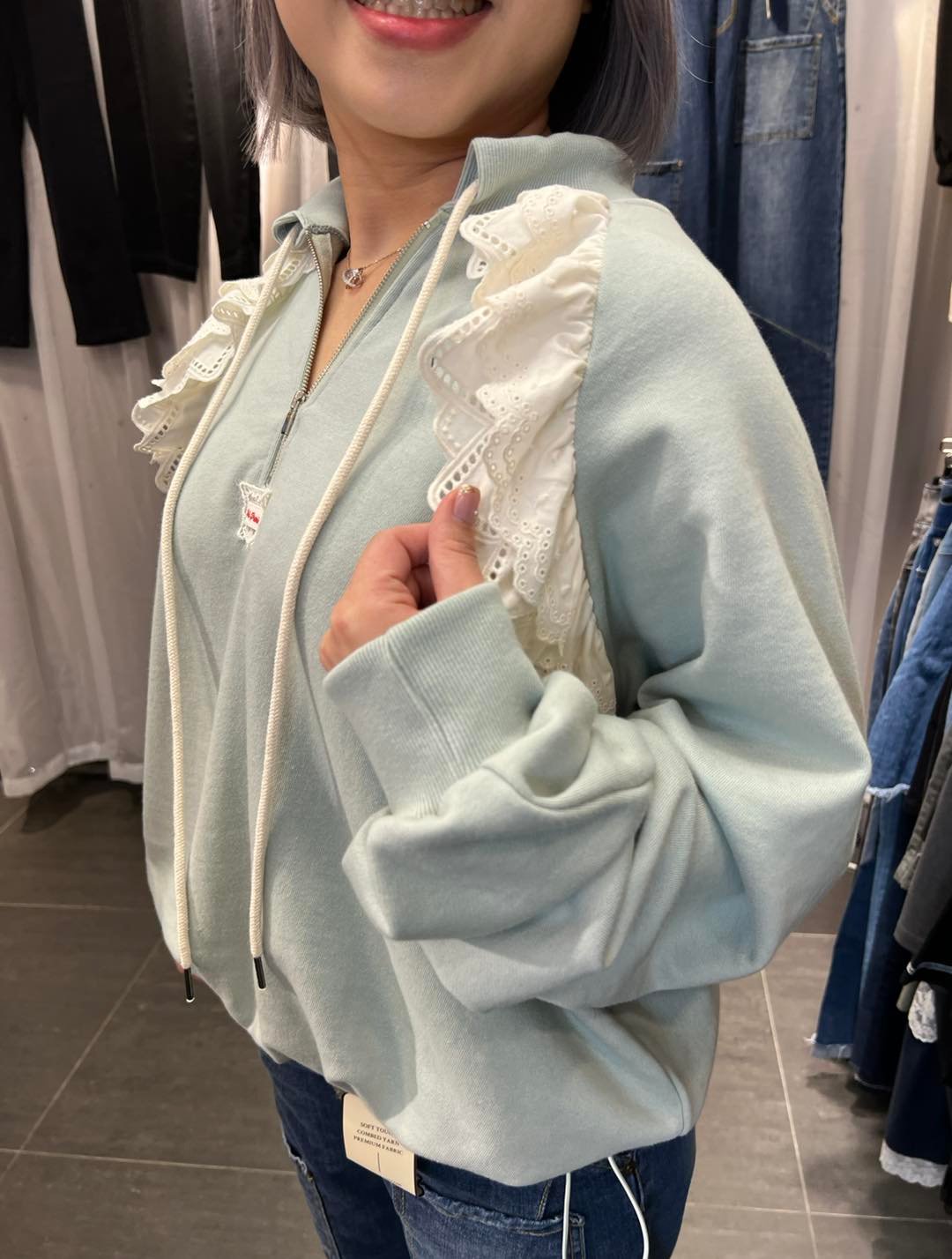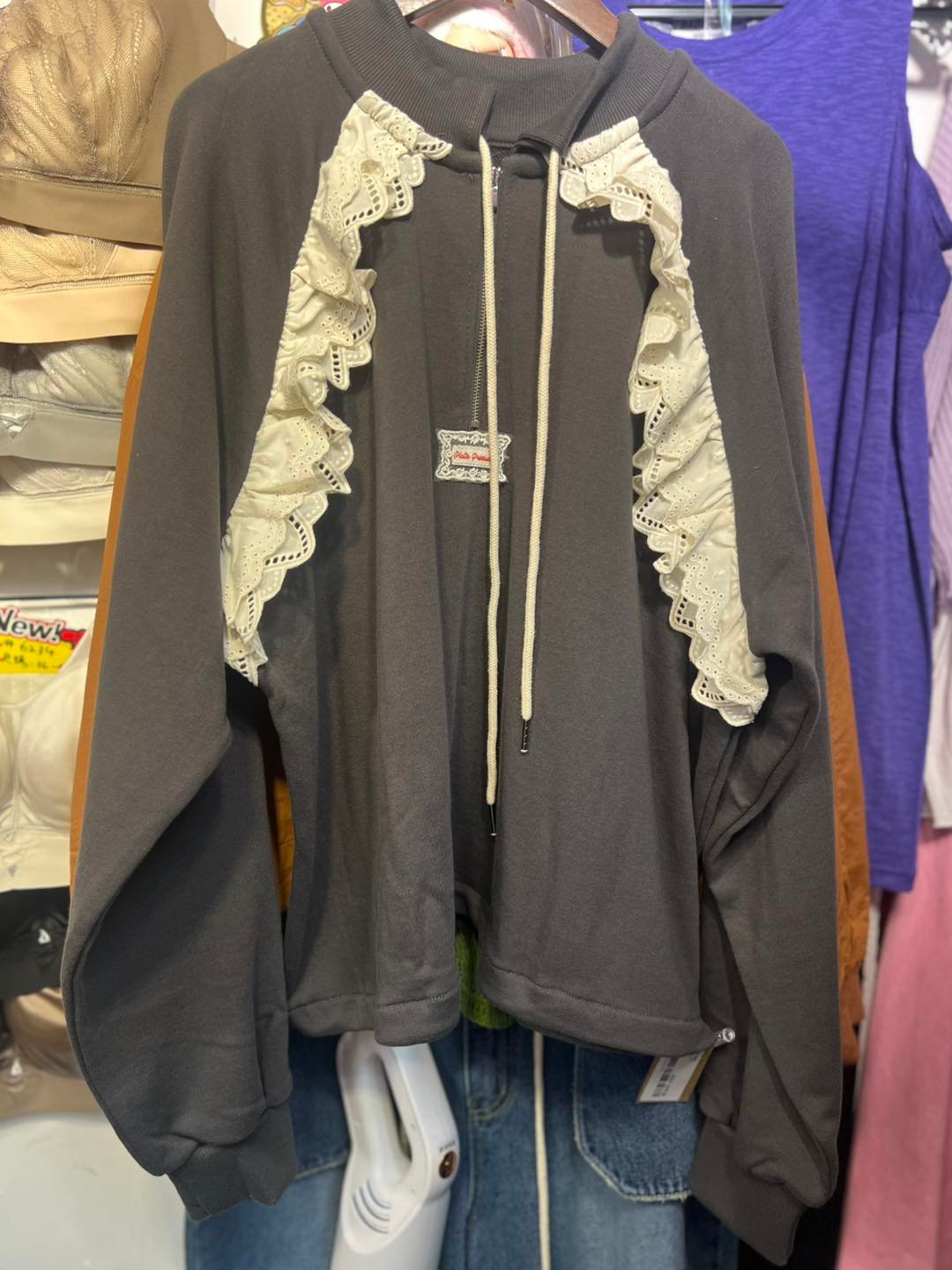 #6491 秋季牛角袖拼波浪通花邊拉鍊棉料衛衣