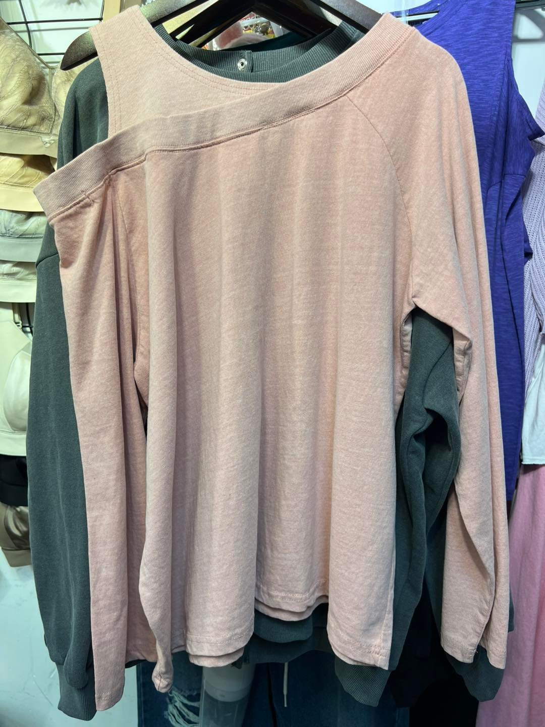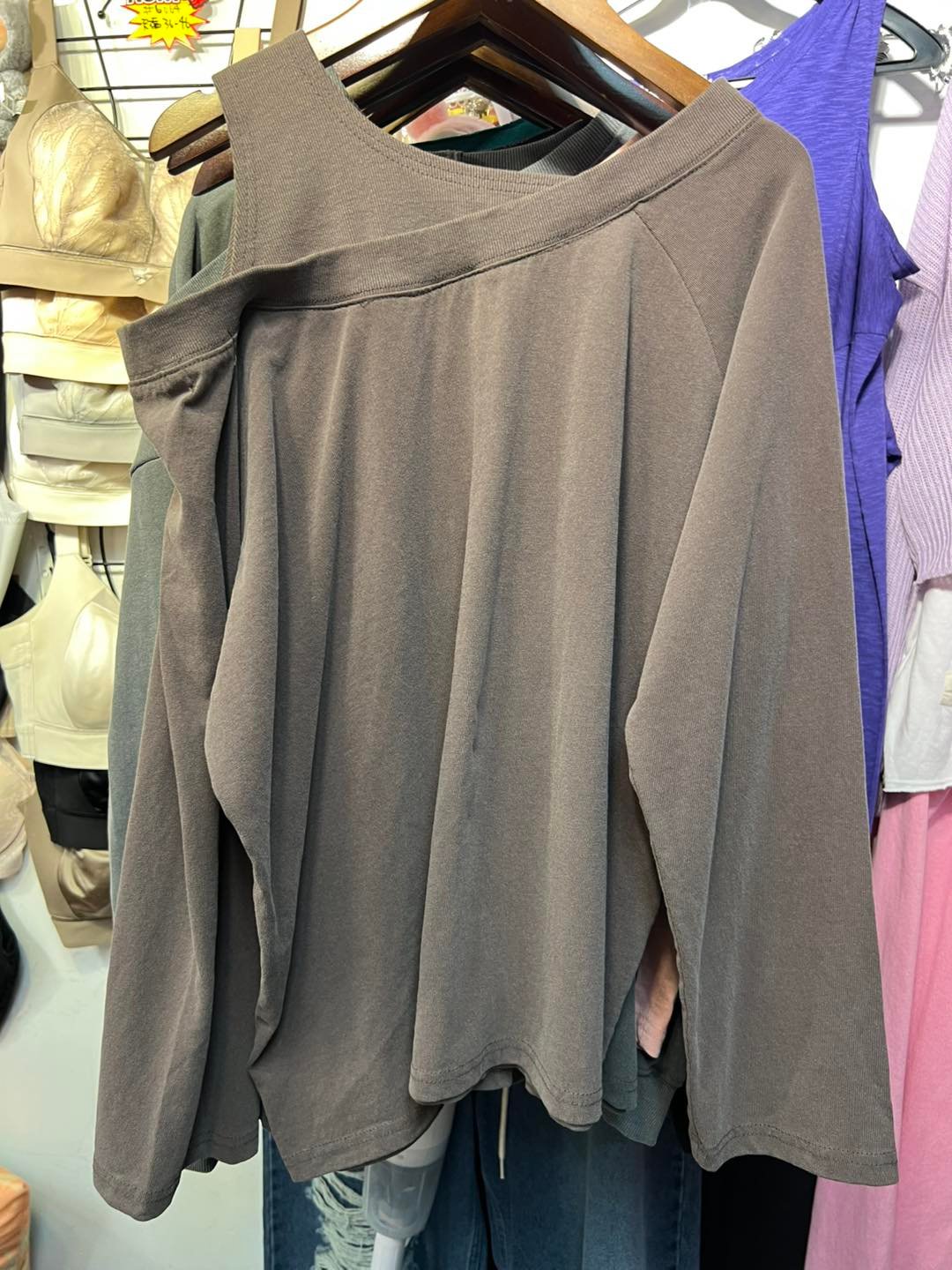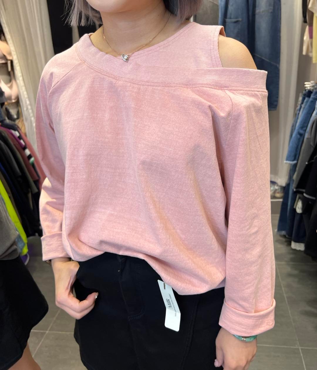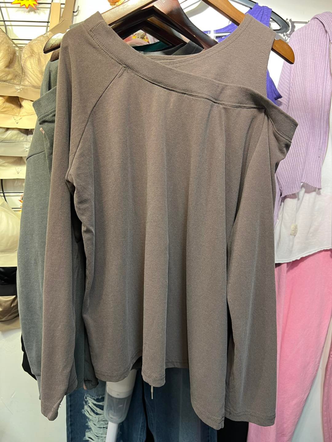 #6497 秋季單邊露膊洗水棉料TEE