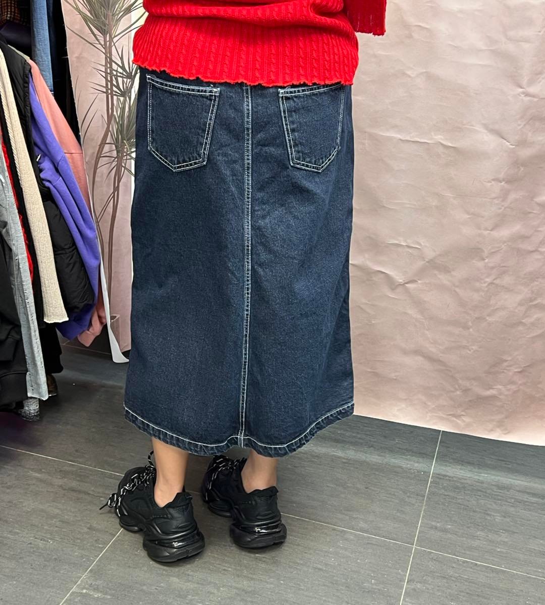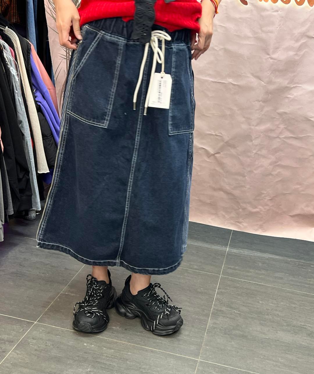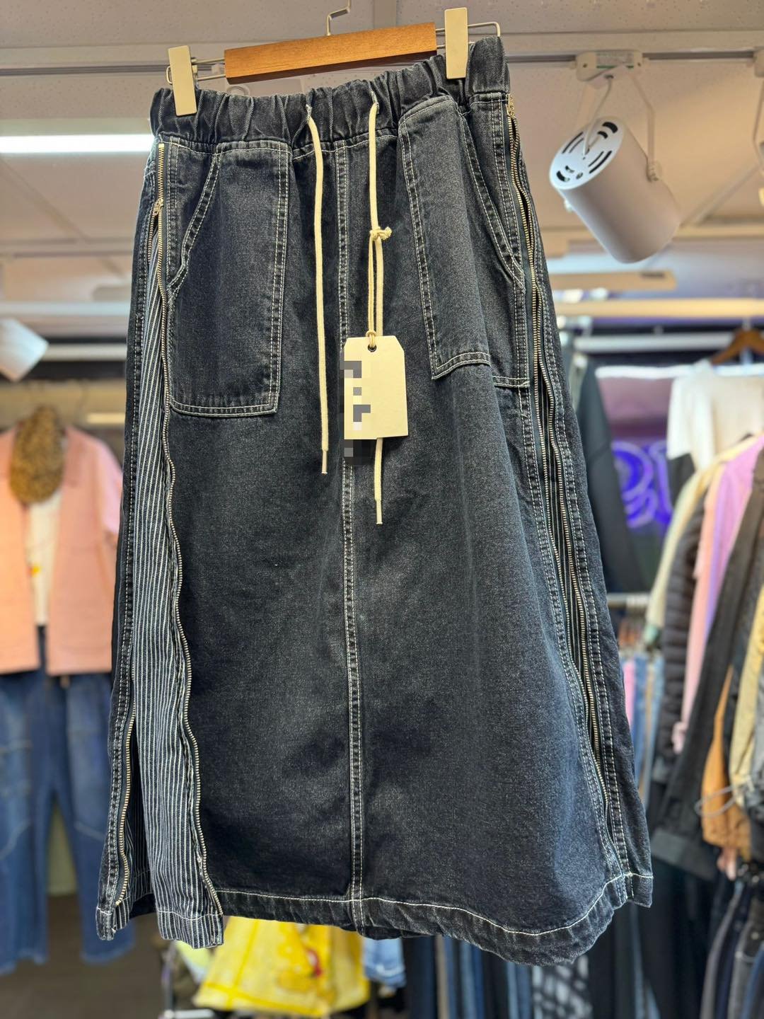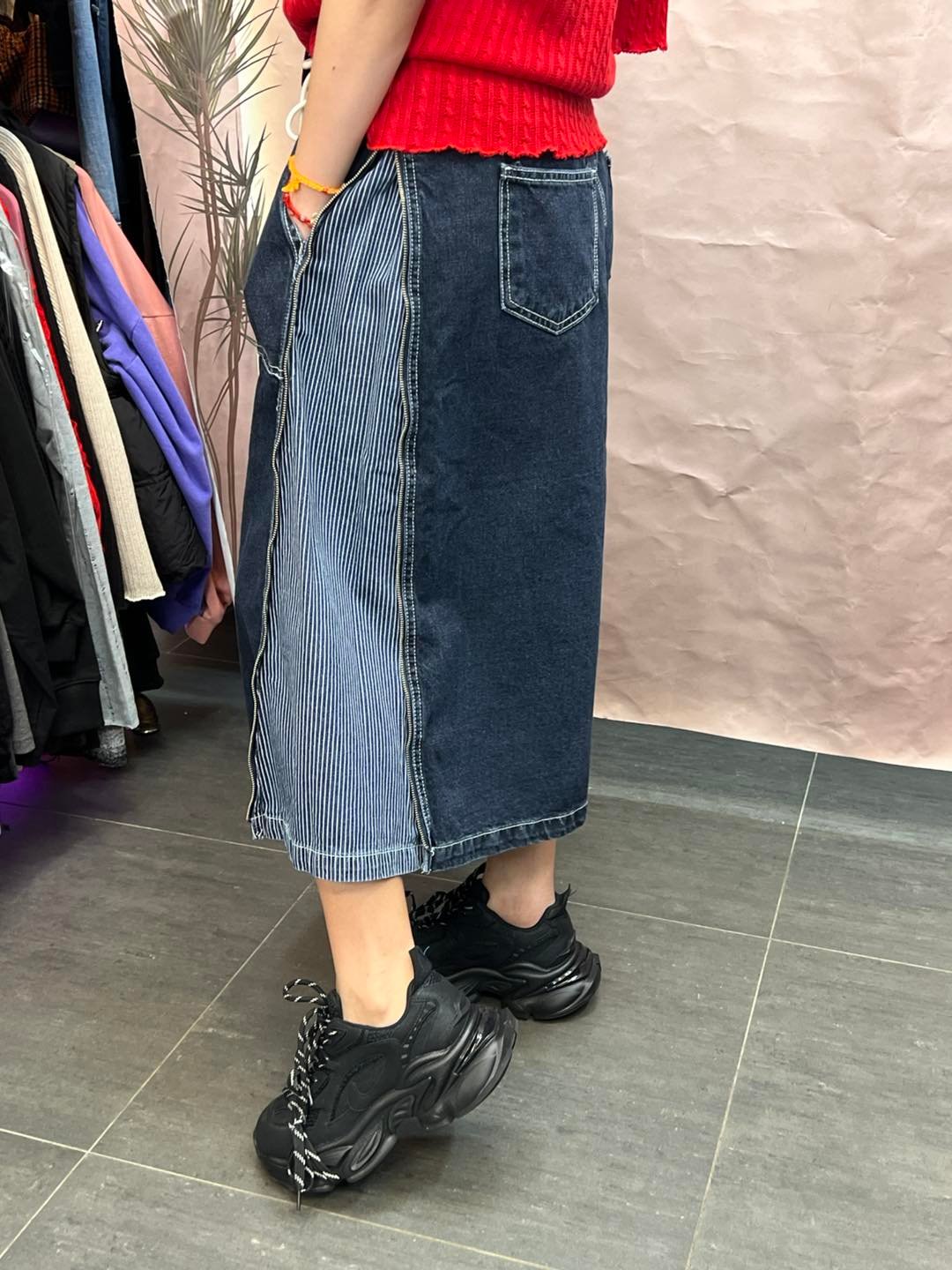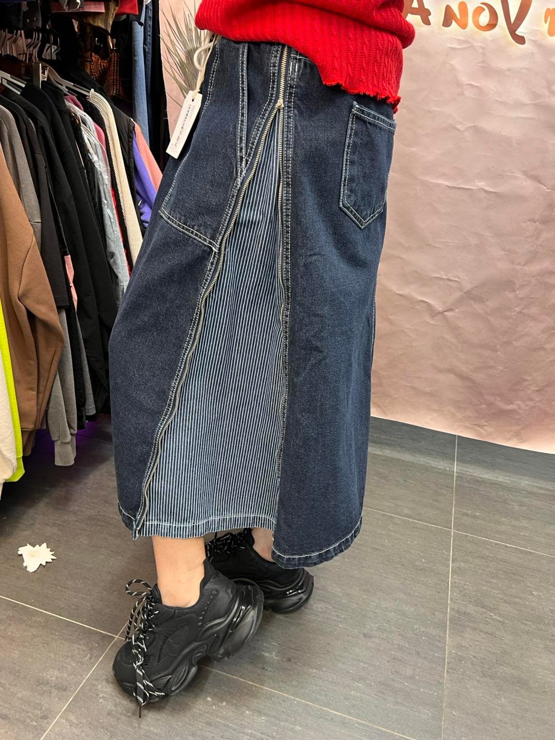 #6529 秋季藍色條子拉鍊拼布牛仔半截裙