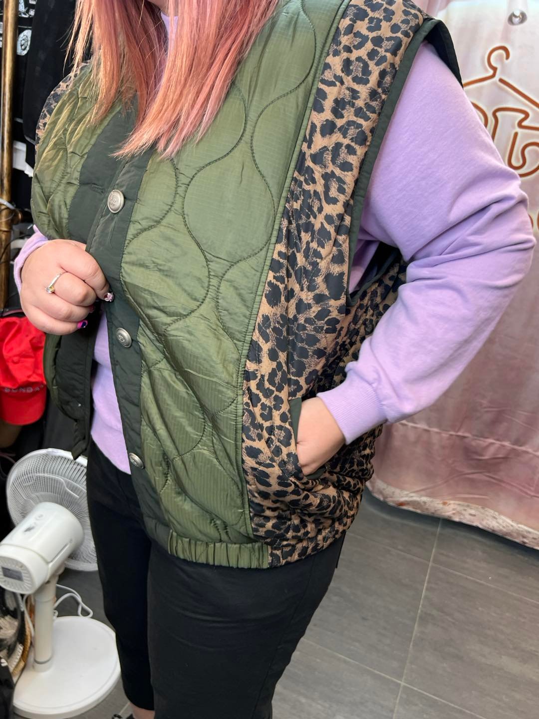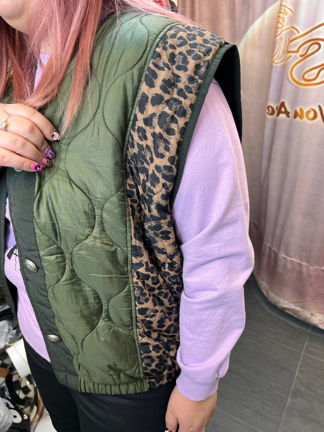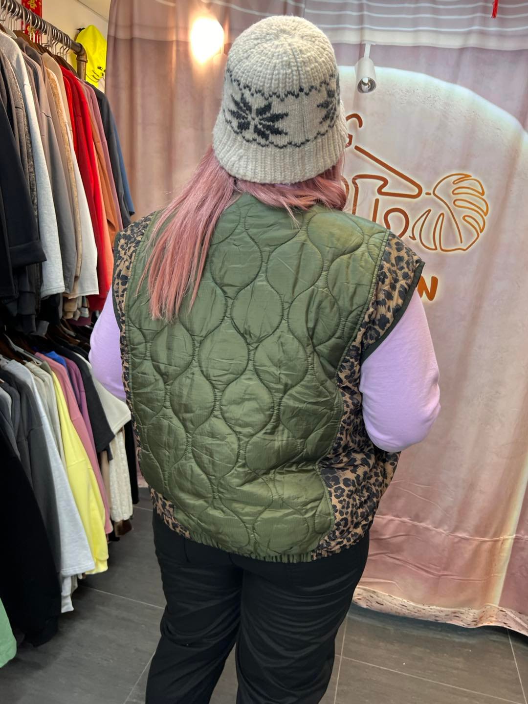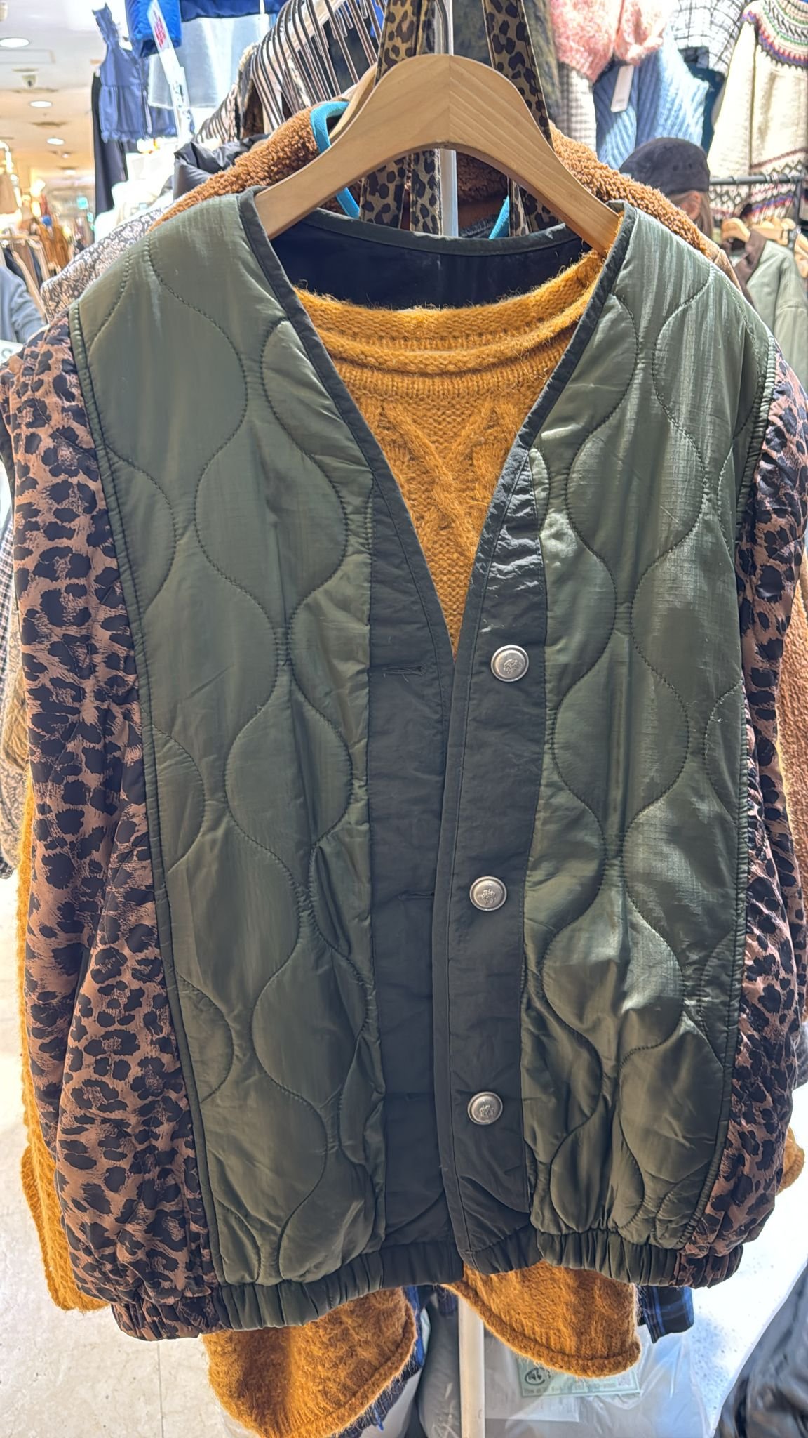 #6734 冬季綠色豹紋拼布背人夾棉外套