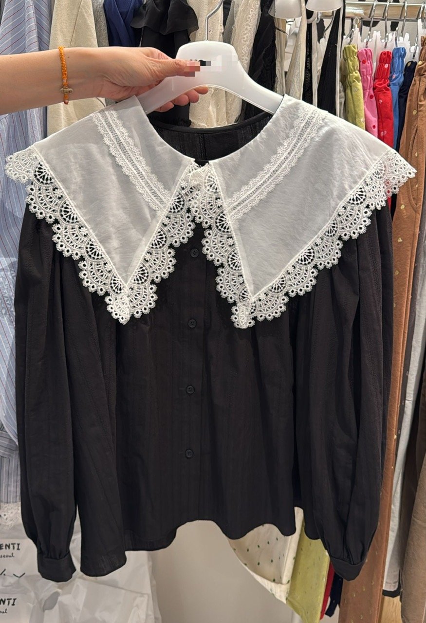 #6822 春季白色通花領黑色提花布上衣