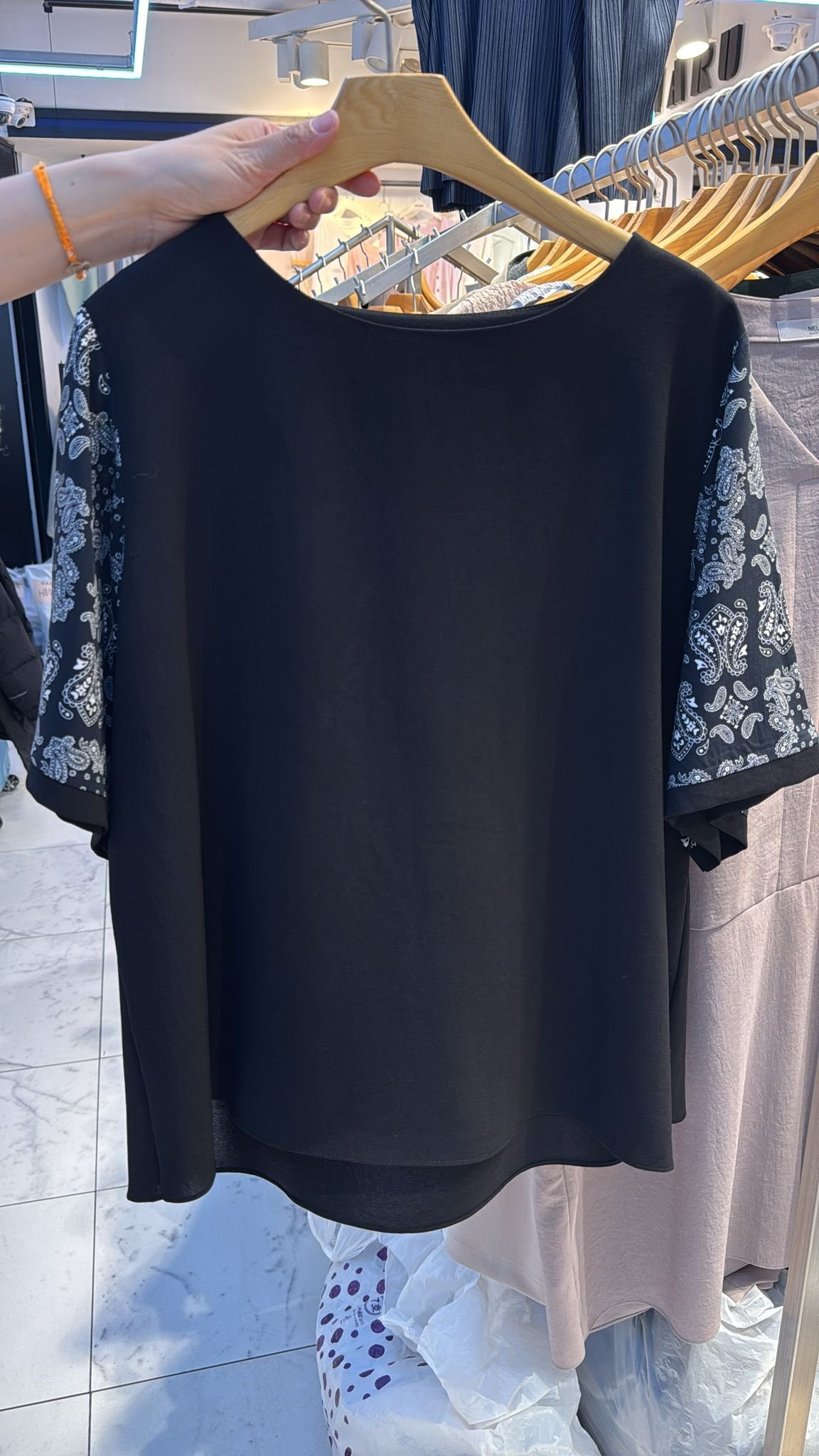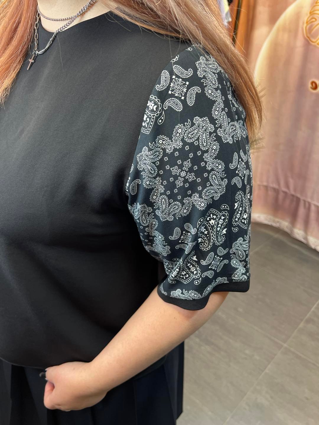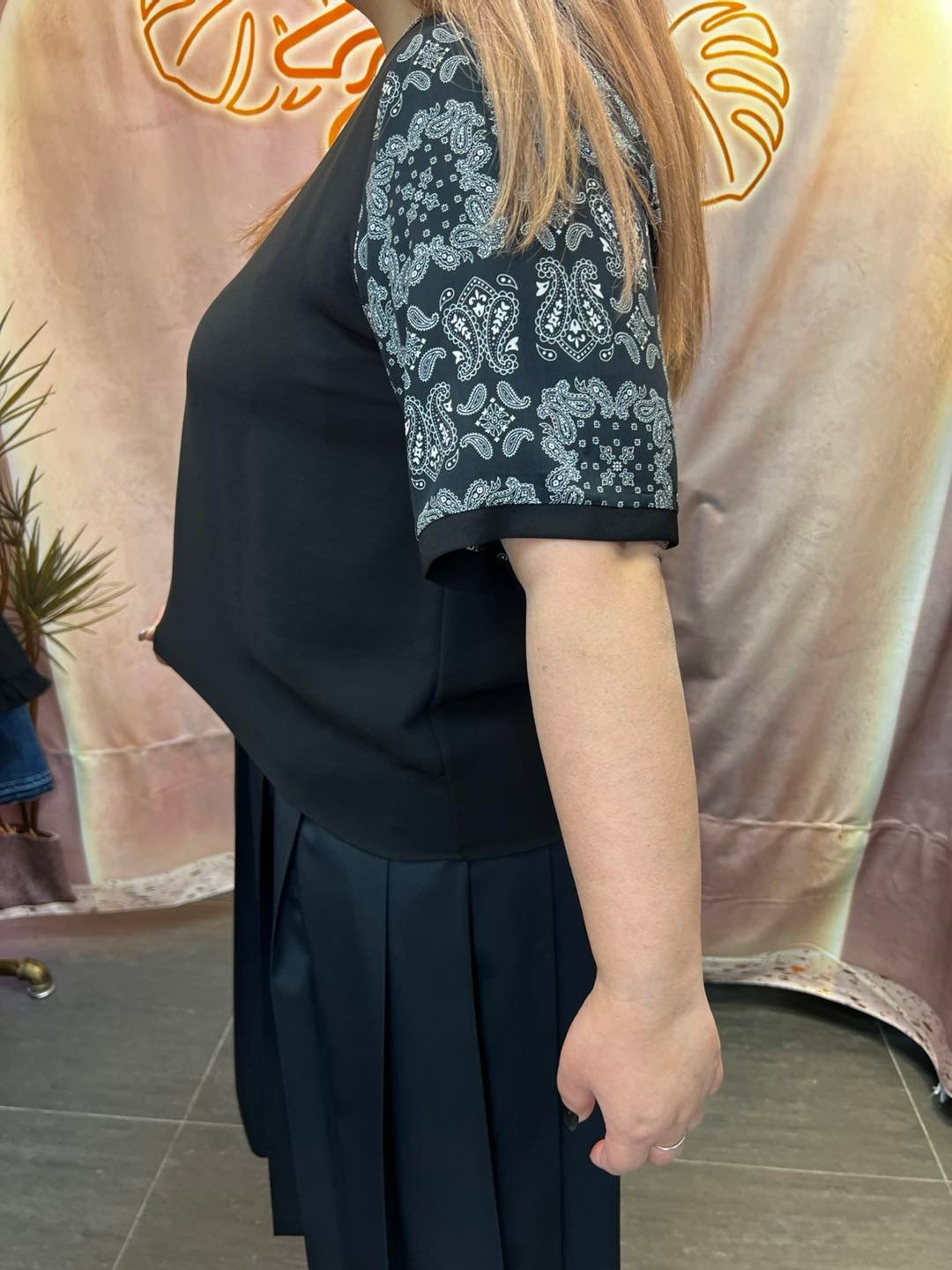 #6868 春季黑色手袖腰果花拼布雪紡上衣