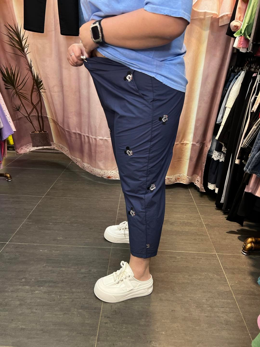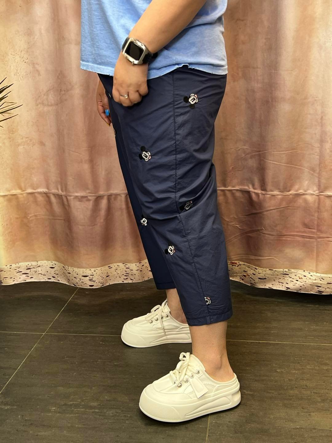 #6970 夏季深藍色米奇繡花直腳扯布褲